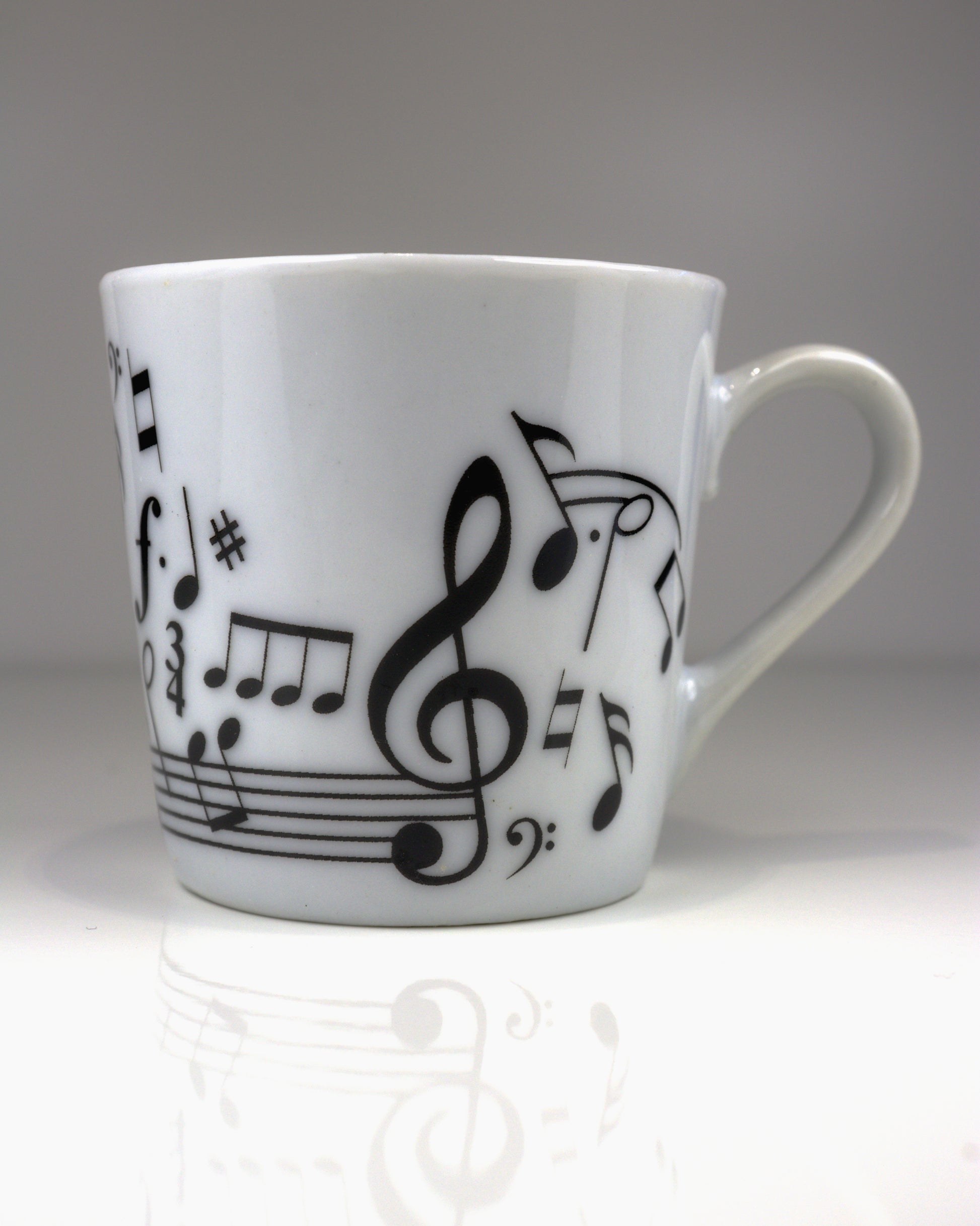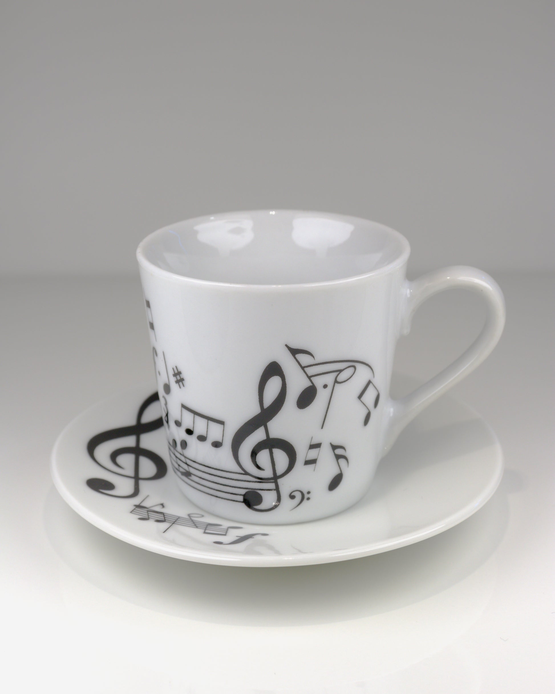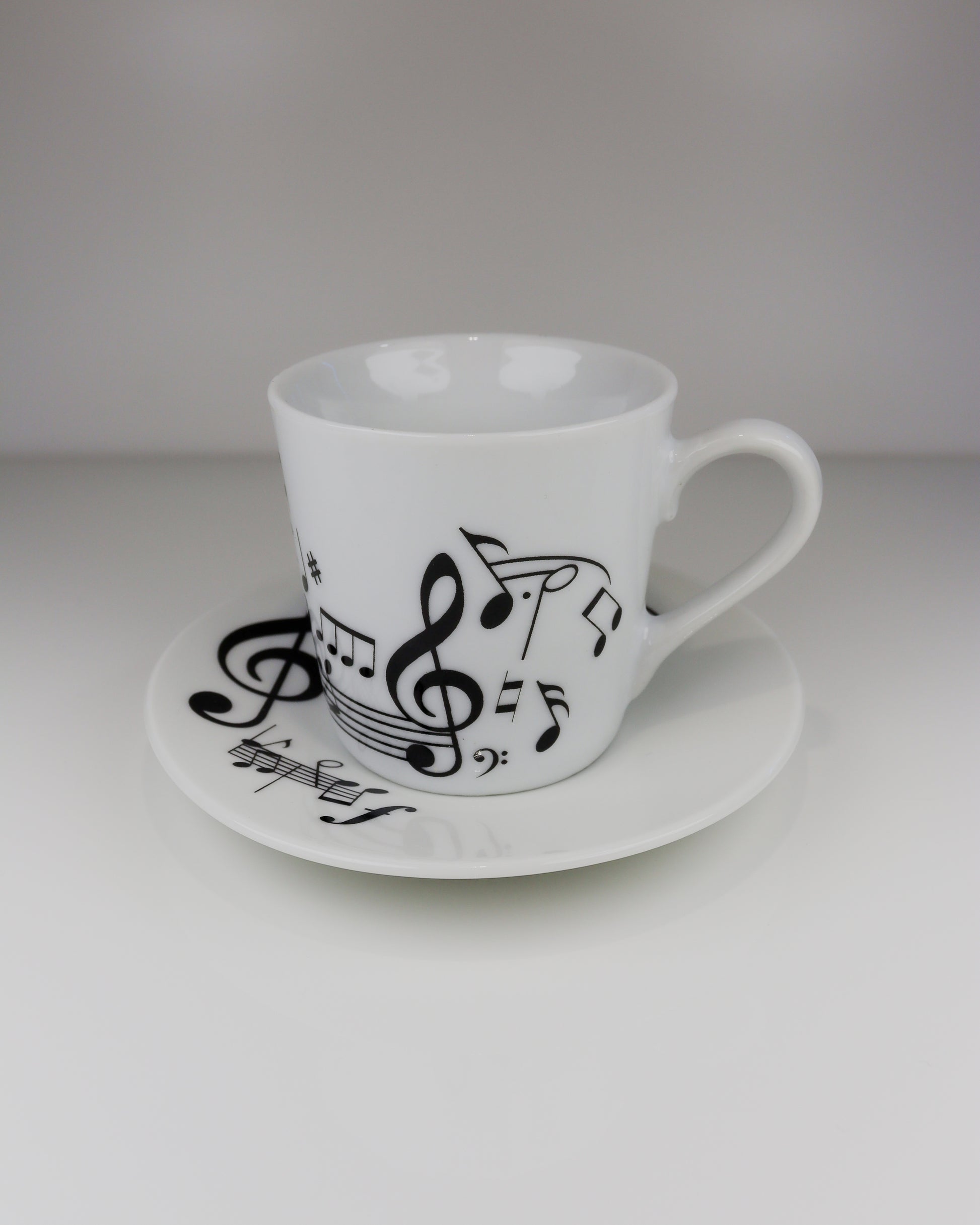Traga um toque de inspiração musical aos seus momentos de pausa com esta elegante chávena de café com pires em porcelana, decorada com claves de sol, notas e pautas musicais com um detalhe perfeito.