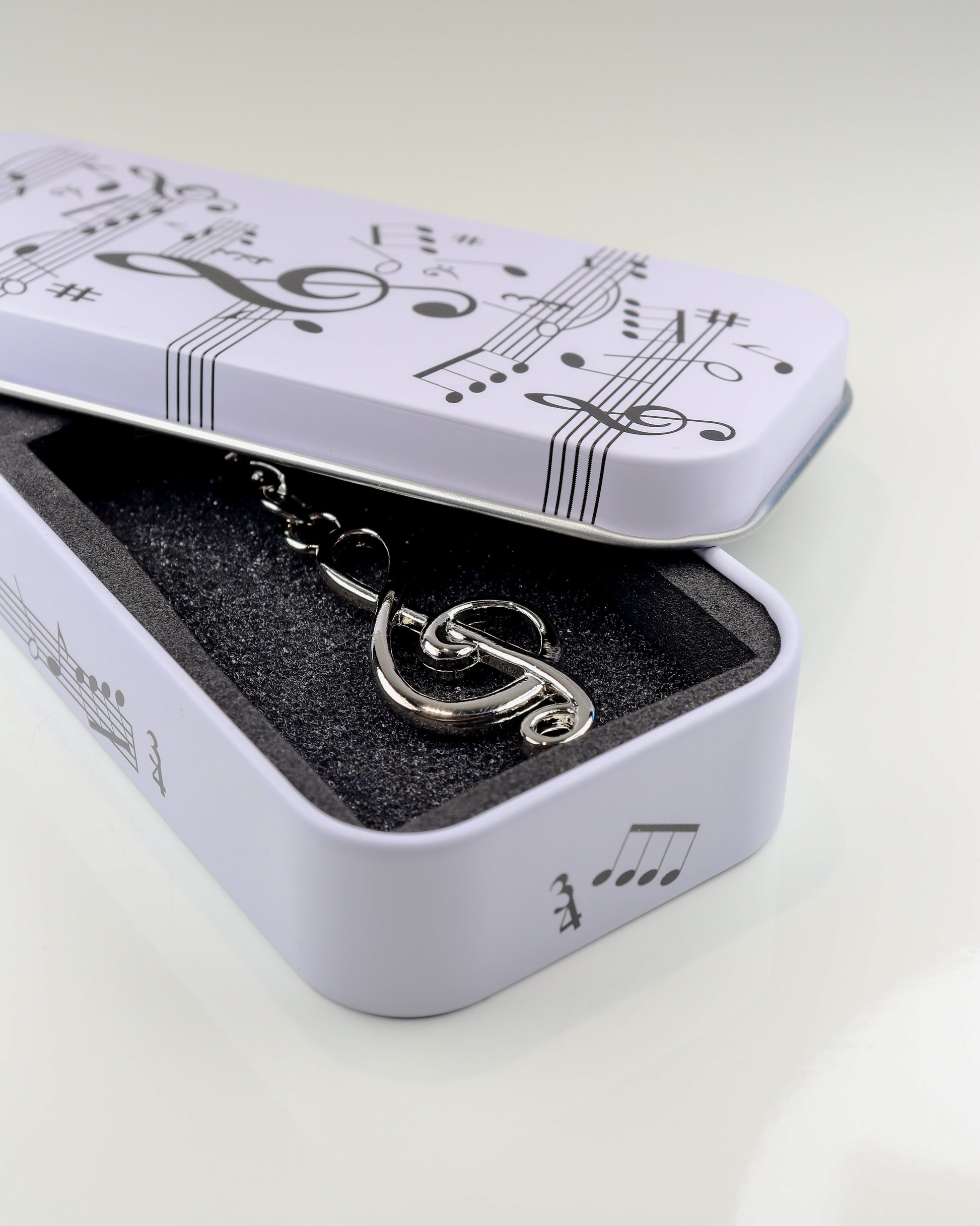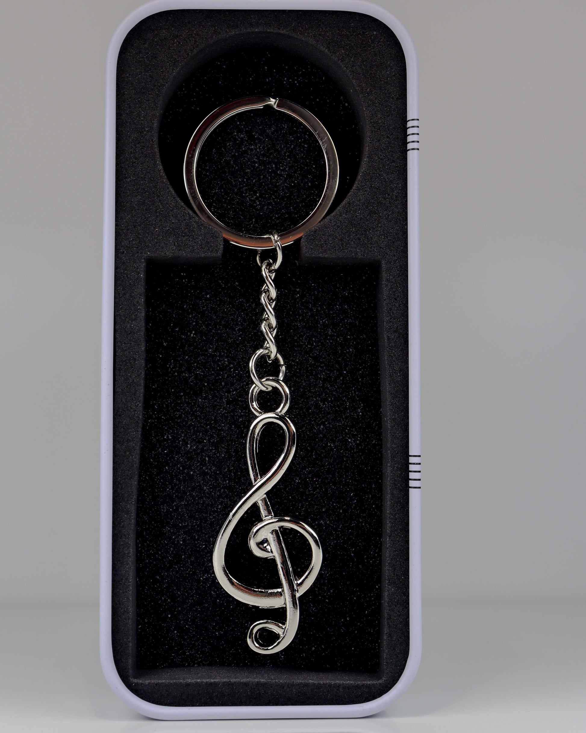 Elegante e cheio de significado, este porta-chaves em forma de clave de sol é o acessório perfeito para músicos e amantes da música. Feito em metal resistente e acompanhado por uma caixa de oferta ilustrada com pautas e notas musicais, é uma peça ideal para usar no dia a dia ou para oferecer a alguém especial.